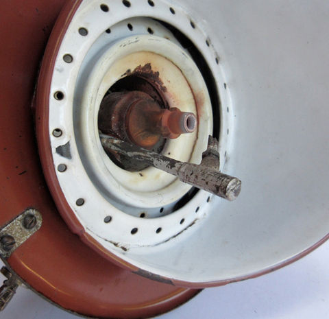 An extremely scarce wall mounted variant with peaked brown enamel shade and side mounted gas control and fixing point. In complete and original condition, perhaps mounted over a signal box Train Register Table or illuminated platform Wall Information Sign. Shade diameter 220mm