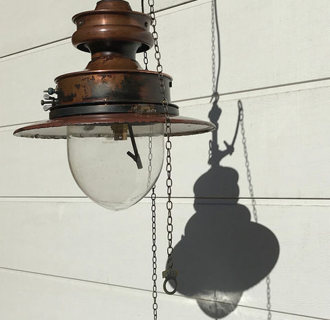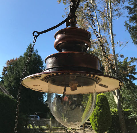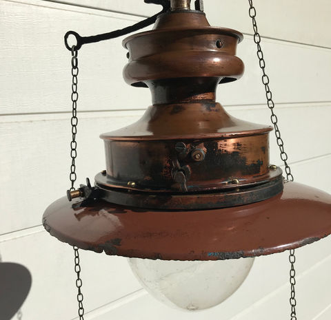 A stunning British Railway Western Region Sugg Platform gas light. Complete with glass globe, control chains, brown enamel reflector and all key components. The brass and copper work has an aged patina with evidence of blue paintwork at some stage in service life. Sensitively converted to 240volt electricity supply to allow easy installation and illumination of your man cave.