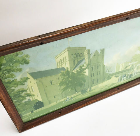 A very original glazed Southern Railway carriage print, depicting St Cross Winchester by Hesketh Hubbard. Mahogany framed, in very good ex-service condition, ready to screw to your study wall.