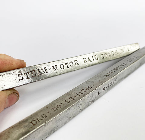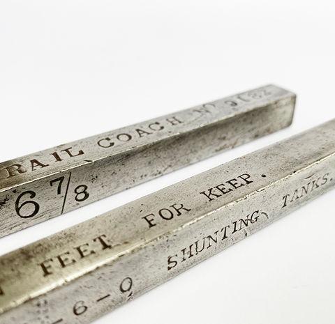 Early steam locomotive workshop length test rods. Clearly marked with numerous reference details, registration numbers and the title ‘Steam Motor Rail Coach No.9182’