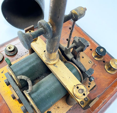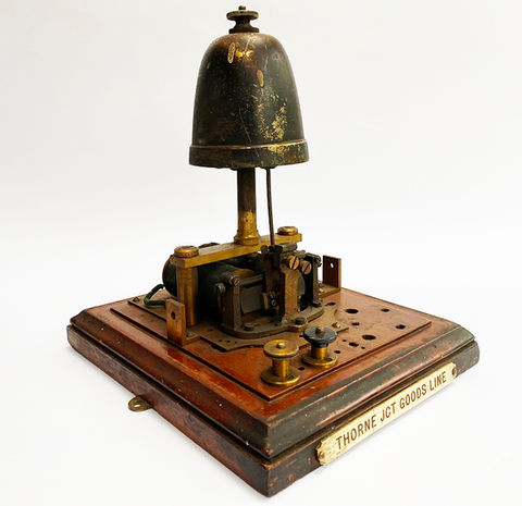Wonderful Great Central Railway block bell in the very difficult to find ex-box untouched condition. Retaining the original bone engraved name plate ‘THORNE JCT GOODS LINE’ and with in-service grime, paint spots and brass bell aged patina. The case is nicely stamped GCR and with an in-service brass cover plate fitted when the instrument was converted from a tapper instrument. Solid mahogany case with box joint construction. The internal mechanism is complete and in working condition. Great bell tone on a 12v supply.