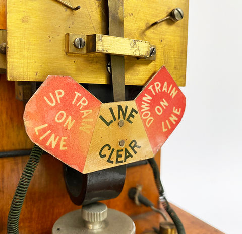 A scarce GWR Crossing Keeper’s train indicator. A lovely small proportion instrument combining a block bell and train movement indicator panel. Fantastic ex-service condition complete with all components and fittings. Solid mahogany dovetail construction with original polish finish. Stamped GWR to the case front and internally behind the coil mechanism. Free swinging indicator needle. H 450, W 200mm