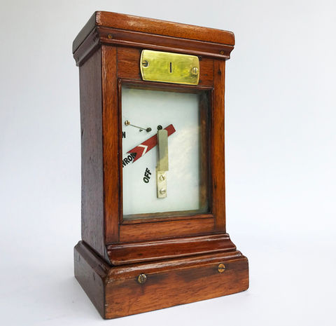 A delightful Great Western Railway pre-grouping distant signal indicator instrument. In very good original condition, the elegant solid mahogany cabinet retains the original French polish finish with lovely rich patina and complementary brass number plate. The internal mechanism is stamped ‘GWR’ with ‘Subway Jct’ hand-written to the internal case side. Free swinging signal arm. H 245 W 130 D 115