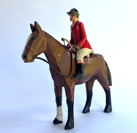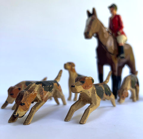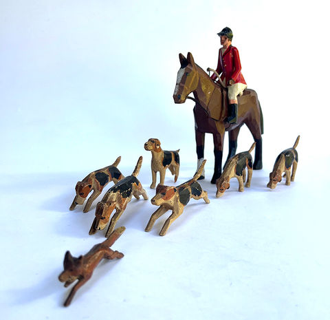 A starter collection of The Forest Toys hunt set in original condition, including Huntsman, six Fox Hounds in various poses, matching paintwork and a running Fox. Four pieces have suffered some play wear, representative of a collection with this age. We have chosen not to attempt repairs and to lose originality. Please view images for condition details.