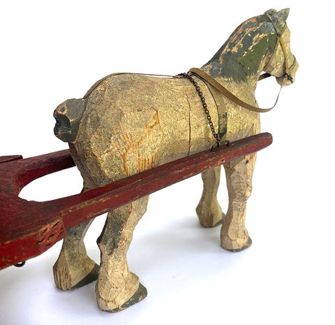 An early example of a Forest Toys Tipping Farm Cart in good original condition. The cartwheels are hand cut from timber, an indication this is an early variant of the later cast iron wheel models. The Farm Horse is beautifully carved with a muscular form and proudly displays his competition rosette. Some play ware which does not detract from the appeal of this scarce Forest Toy. Buckram reins sensitively restored. Please view images for condition details. 350mm long