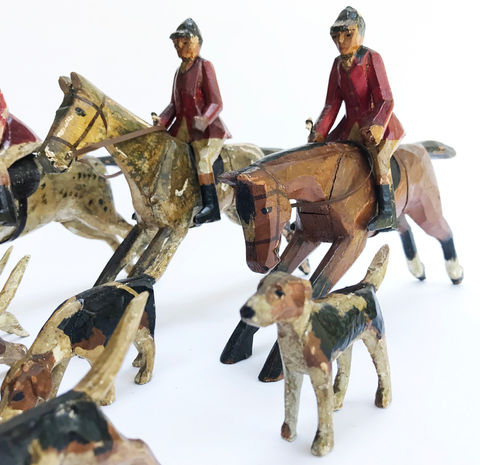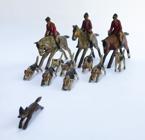 A nicely balanced The Forest Toys from Brockenhurst Hunt Set comprising x3 Huntsmen, x8 Hounds & x1 Fox. Some play ware but otherwise in good original condition. This is an interesting collection where Whittington and his small team have consistently ‘dirtied’ the paintwork presumably to more accurately represent hunt conditions. Perhaps a private commission? Either way an unusual and scarce example.