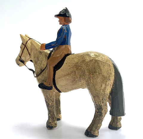 A desirable addition to your Forest Toys Fox Hunt collection, a girl rider with blue top and stocky dappled grey pony. A lovingly cherished item in very good condition with original buckram reins. Please view images for condition details.