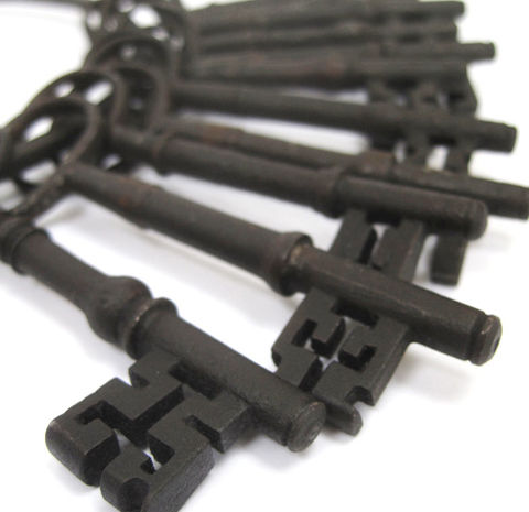 A wonderful set of x11 large iron Georgian Church Keys suspended on their original hand forged retaining ring. The keys are all the same size with matching bow details. The delicate curled return on the forged ring is a delightful detail. Ring Diameter 140mm Key Length 95mm