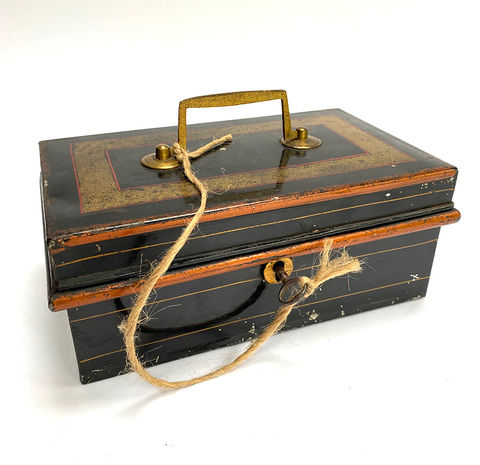 A nicely presented small Edwardian cash tin. Handmade tin plate construction with hand painted decoration. Internal compartments and working lock. Width 205mm, height 80mm. Please view images for condition details.