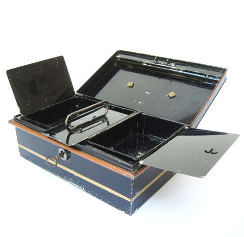 A lovely small proportioned English household cash box. Tin plate construction with hinged lid and removable coin compartments. Beautifully painted with hand applied lining and gold gilding. Complete with original key and working lock. In good condition with some expected in-service paintwork chips. L: 230mm W: 145mm H: 85mm