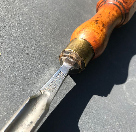 A delightful cast steel gouge with a London Pattern handle from the desirable and renown Sheffield tool maker J Howarth. The gouge handle has a lovely aged patina complemented with several owner stamp marks – G. A. SCATTERGOOD. Complete and ready to complement a quality vintage tool kit.