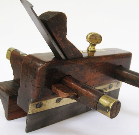 A beautiful beech and brass plough plane in original condition complete with No.7 blade by \Isaac Greaves Sheffield\ and stamped to the body by two previous owners \H. ROOK\ & \W. BLANCH\. L: 210mm W: 210mm H: 170mm