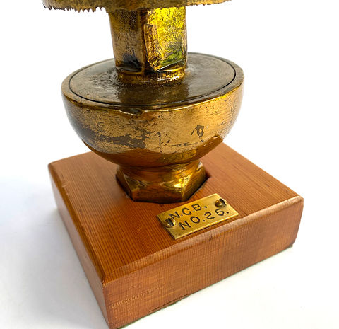 Steam locomotive steam whistle as fitted to National Coal Board 0.4.0 saddle tank No.25. The smaller pattern whistle originates from the Great Western Railway and is stamped ‘GWR’ in three locations. Nicely restored and presented with small brass description plate. NCB Loco photo accompanies the whistle. Please view images for condition details.