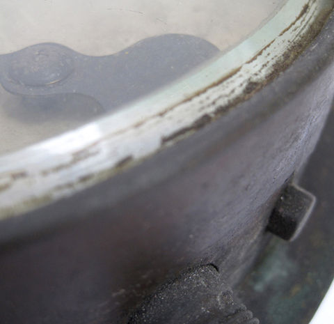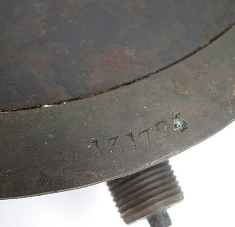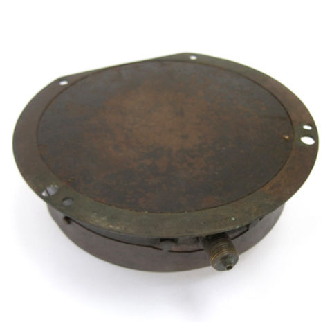 A Great Western Railway locomotive pressure gauge in original un-restored condition exactly as it was when removed from the loco back head many years ago. In this condition a rare survivor and nicely stamped around the rim with company initials 'GWR' date stamp '1-4-02' and '131724'. Beautifully proportioned instrument face with engraved GWR initials pressure calibration scale and hand painted pressure limit arrow. Complete with original thick bevel edge glass cover face. D: 50mm Diameter: 210mm